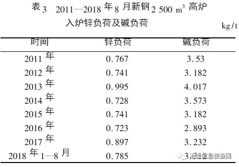 2013 年,新鋼2 500 m3 高爐入爐鋅負荷、堿負荷分別高達0. 995 kg /t 和4. 017 kg /t( 見表3) ,遠遠高于國標(biāo)要求。高爐90% 以上的鋅負荷和60% 左右的堿金屬負荷來自燒結(jié)礦,這也是爐料結(jié)構(gòu)中高比例燒結(jié)礦給高爐生產(chǎn)帶來的新問題,同時也是近年來新鋼兩座2 500 m3 高爐有不同程度結(jié)厚的重要原因。近年來新鋼2 500 m3 入爐鋅負荷、堿負荷情況見表3。
