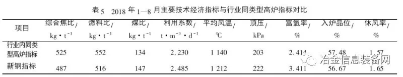 2018 年1—8 月新鋼2 500 m3 高爐主要技術(shù)經(jīng)濟指標(biāo)與行業(yè)內(nèi)同類型高爐指標(biāo)對比見表5。